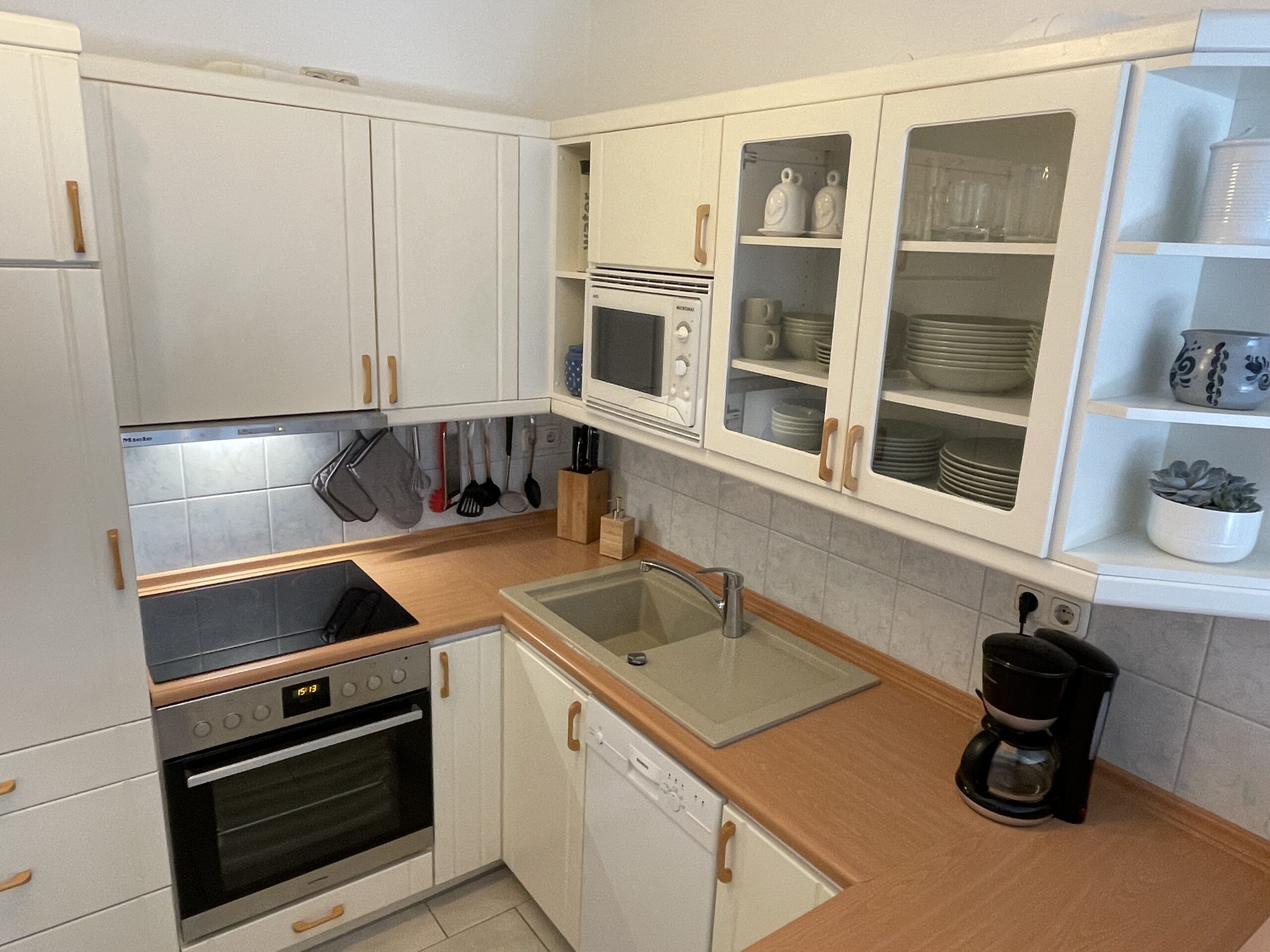 Küche und Bad bieten auch für längere Aufenthalte alle nötigen Annehmlichkeiten. Kuchen backen? Wäsche waschen? Bügeln? Alles kein Problem!